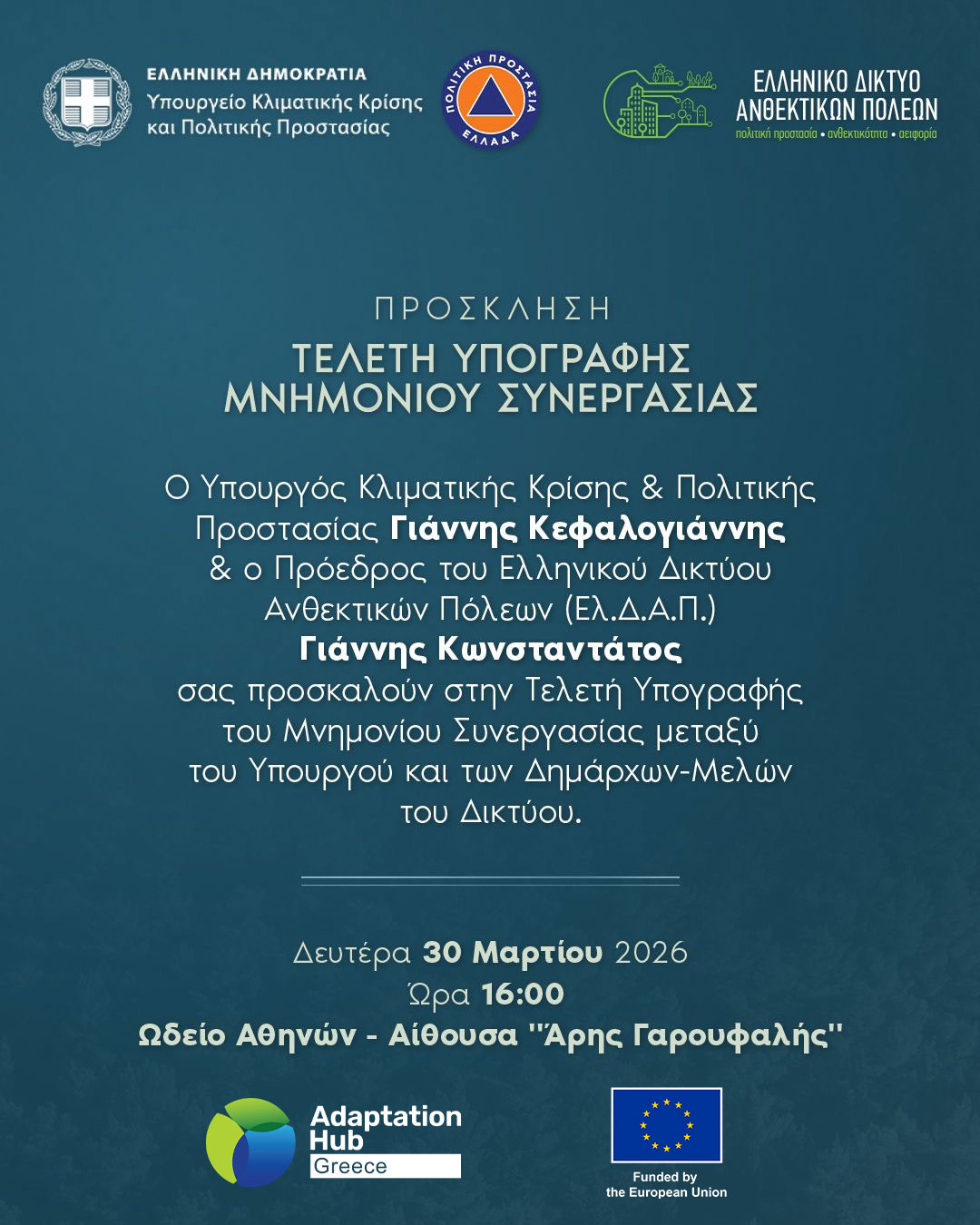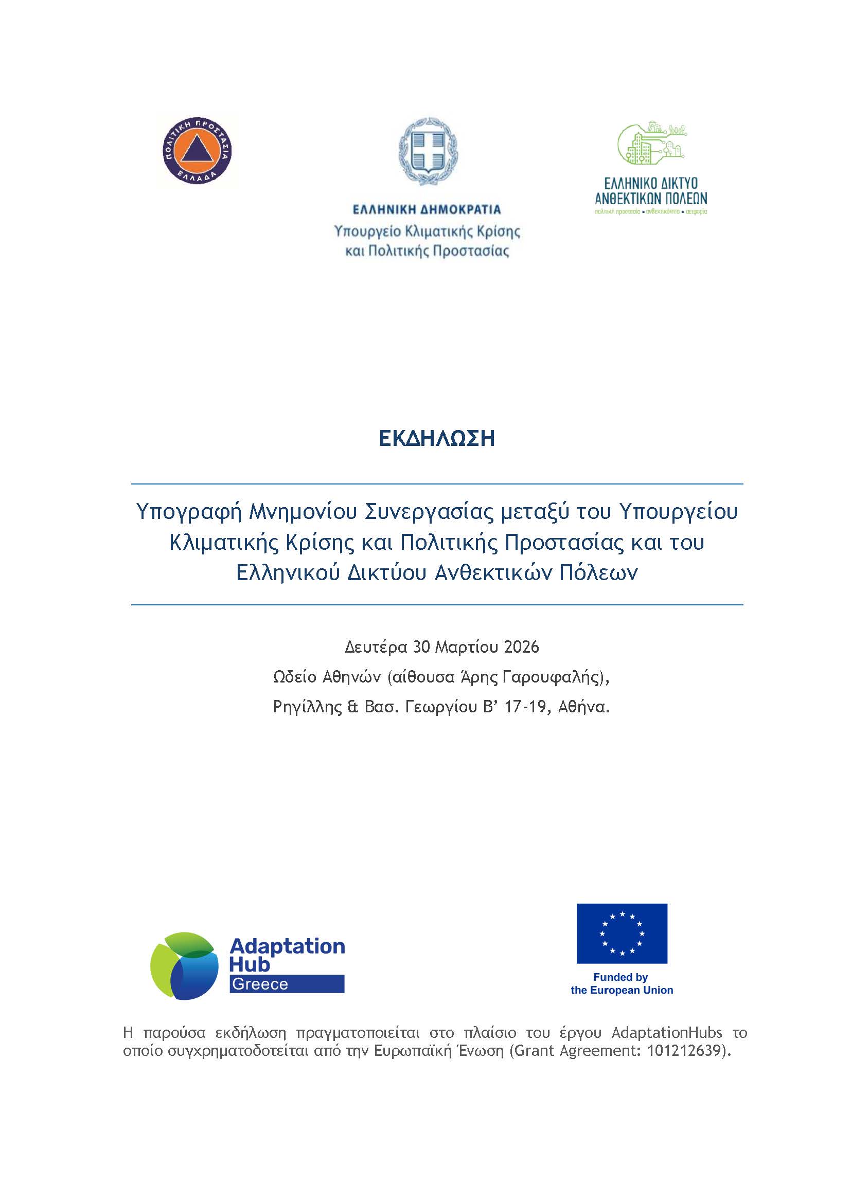 Η Πρόσκληση και το αναλυτικό πρόγραμμα της τελετής για την Υπογραφή Μνημονίου Συνεργασίας μεταξύ του Υπουργείου Κλιματικής Κρίσης και Πολιτικής Προστασίας και του Ελληνικού Δικτύου Ανθεκτικών Πόλεων που θα πραγματοποιηθεί την Δευτέρα 30 Μαρτίου 2026 και ώρα 16:00 στο Ωδείο Αθηνών – Αίθουσα “Άρης Γαρουφαλής”.