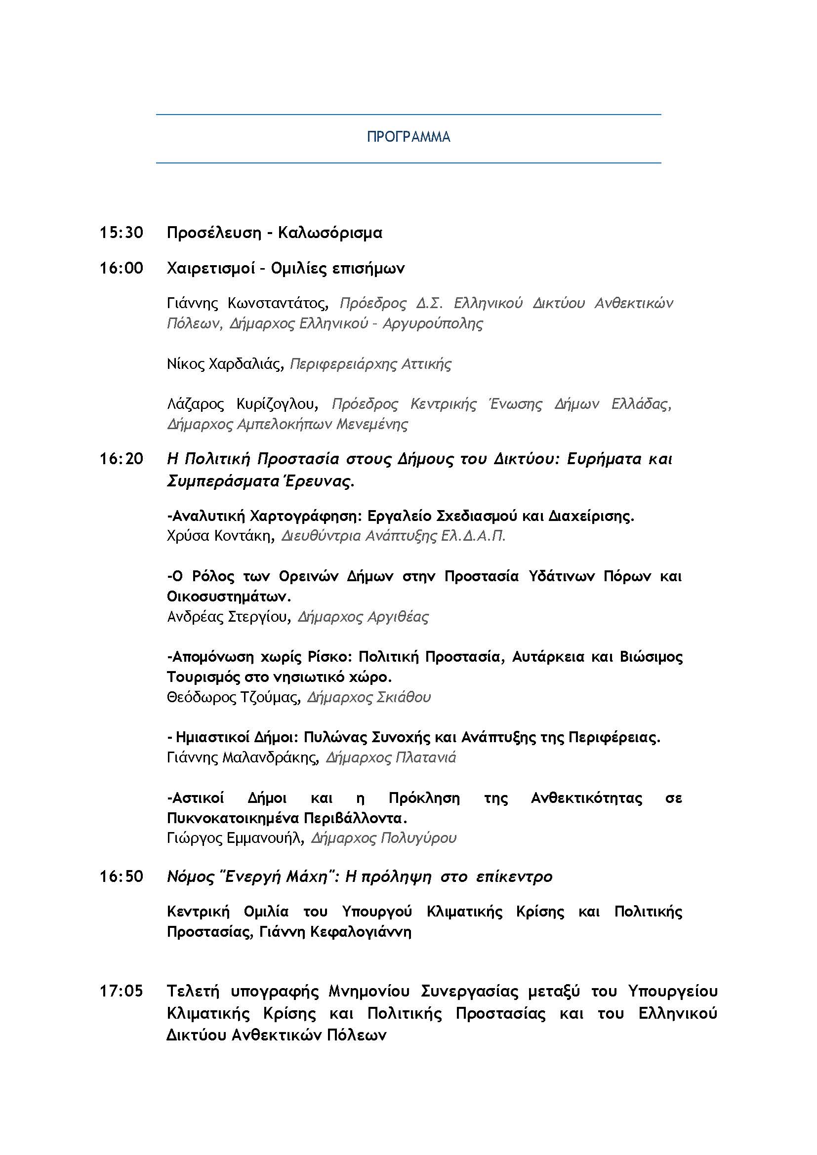 Η Πρόσκληση και το αναλυτικό πρόγραμμα της τελετής για την Υπογραφή Μνημονίου Συνεργασίας μεταξύ του Υπουργείου Κλιματικής Κρίσης και Πολιτικής Προστασίας και του Ελληνικού Δικτύου Ανθεκτικών Πόλεων
